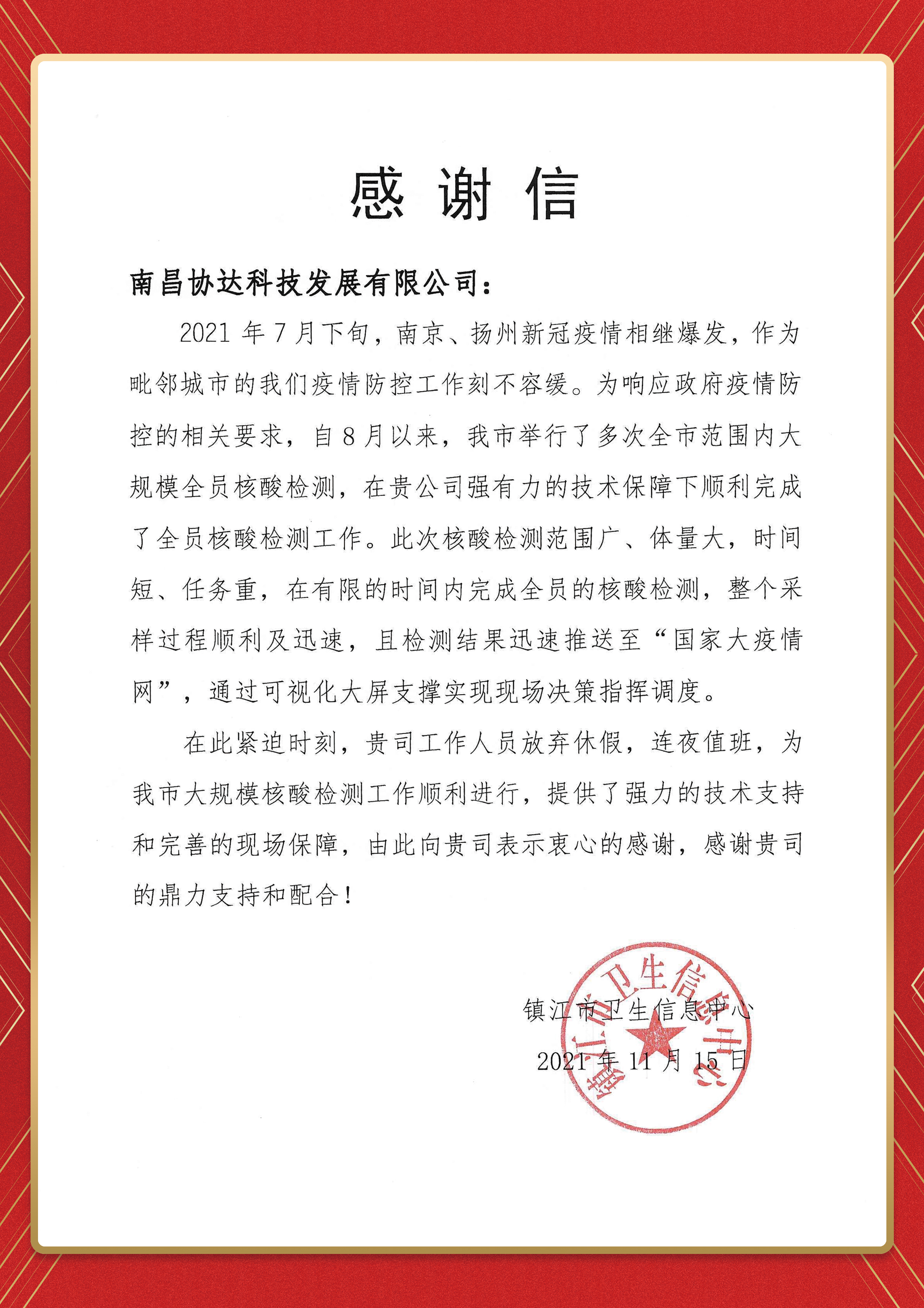 近日,我公司收到一封來自鎮(zhèn)江市衛(wèi)生健康委衛(wèi)生信息中心的感謝信,自新冠疫情爆發(fā)起來,我公司多次收到感謝信,除了對我公司的信任之外,更多的是一份承諾和責(zé)任,協(xié)達科技始終把社會責(zé)任擺在第一位,始終秉持“匠心”專注一個行業(yè)、一件事,不辜負(fù)行業(yè),不辜負(fù)未來。
