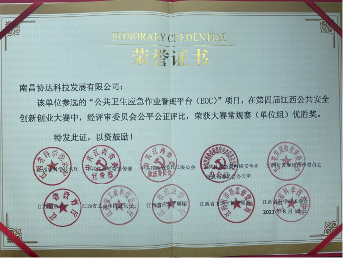 近期,我公司自主研發(fā)且擁有獨(dú)立知識(shí)產(chǎn)權(quán)的《公共衛(wèi)生應(yīng)急作業(yè)管理平臺(tái).EOC》軟件平臺(tái)在第四屆江西公共安全創(chuàng)新創(chuàng)業(yè)大賽傳出捷報(bào),榮獲“第四屆江西公共安全創(chuàng)新創(chuàng)業(yè)大賽”優(yōu)勝獎(jiǎng)。
