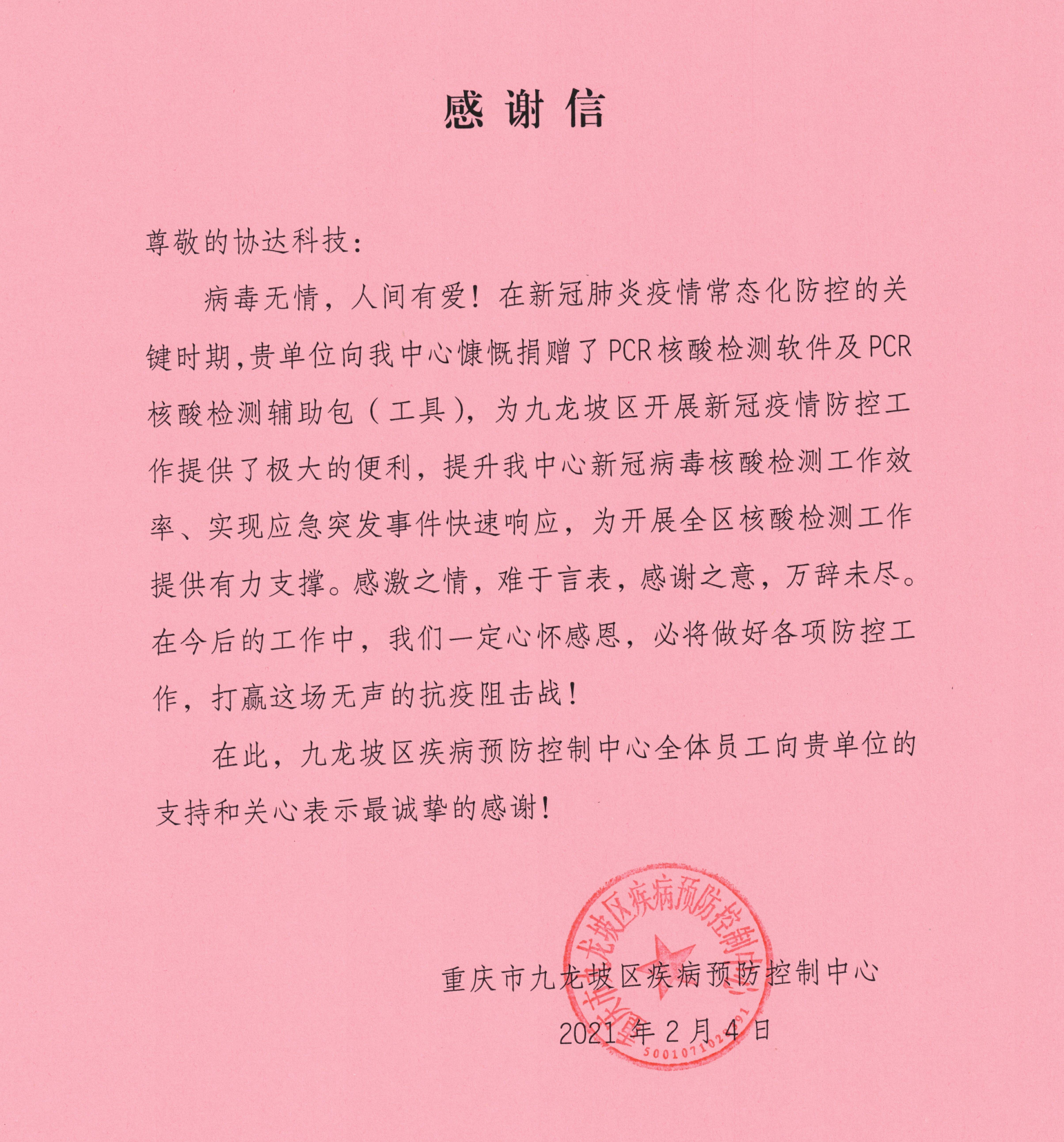 在小年夜,我公司收到重慶市九龍坡區(qū)疾控中心的感謝信,在雙方戰(zhàn)略合作伙伴關系下,我公司為中心疫情防控盡一份綿薄之力,同時履行公司的社會責任,最后,感謝中心的信任和支持,我公司將全力配合支持中心在疫情防控中相關的工作。