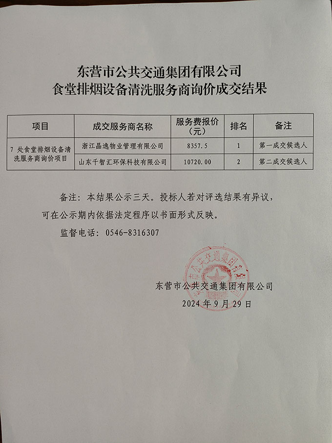 東營市公共交通集團有限公司食堂排煙設(shè)備清洗服務(wù)商詢價成交結(jié)果