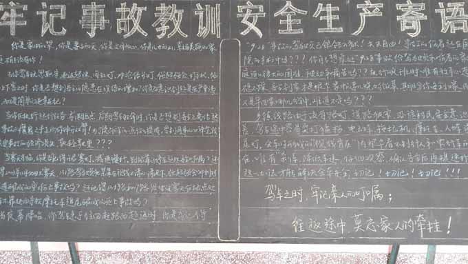 近日,市公交公司汽車三隊(duì)為貫徹落實(shí)好公司第四季度安委會(huì)的會(huì)議精神,做好駕駛員工安全教育,進(jìn)一步抓好車隊(duì)安全生產(chǎn)工作,一是針對(duì)鄉(xiāng)鎮(zhèn)線路的營運(yùn)特點(diǎn),專門出了一期“安全生產(chǎn)黑板報(bào)”,二是專門制作了一幅以“注重安全,關(guān)愛生命”為主題的展板,擺放到大廳里,以此警醒和告誡廣大一線駕駛員,行車中要把安全放在首位,牢記遵紀(jì)守法,按章行車、謹(jǐn)慎駕駛、確保安全。