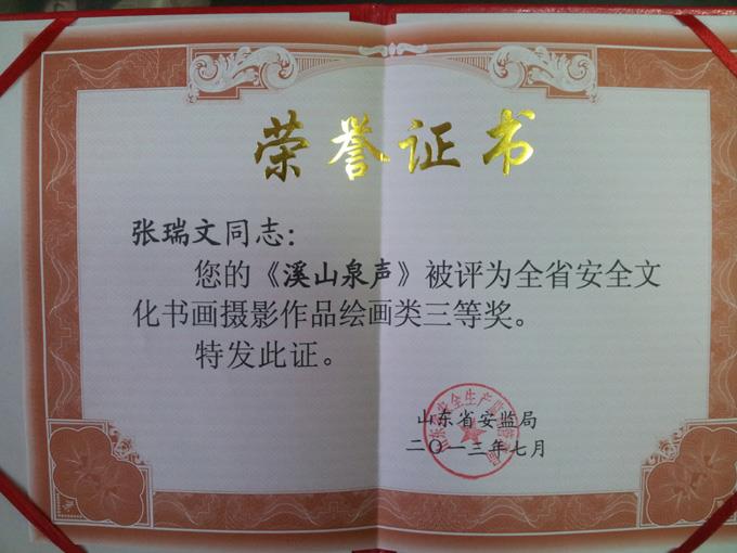 近日,剛剛揭曉的東營市安全文化書畫攝影作品有獎征集活動中,市公交公司廣告部張瑞文的繪畫作品《溪山泉聲》以其豐富的表現(xiàn)力和感染力,獲得三等獎,此作品同時參加山東省安全文化書畫攝影有獎評比活動,亦獲得三等獎。