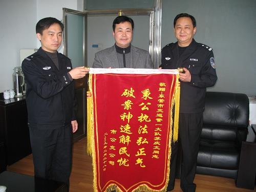 3月2日,為感謝交警部門(mén)秉公執(zhí)法,伸張正義,市公交公司委派汽車(chē)一隊(duì)的兩位隊(duì)長(zhǎng)向事故處理中心干警蘇慶文同志贈(zèng)送了“破案神速解民憂(yōu),秉公執(zhí)法弘正氣”的錦旗。