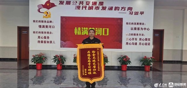 近日,失主楊佳琛帶著一面寫有“拾金不昧完璧歸趙,品德高尚學習榜樣”的錦旗來到東營公交公司汽車一隊,感謝車隊121路駕駛員劉永波的拾金不昧。